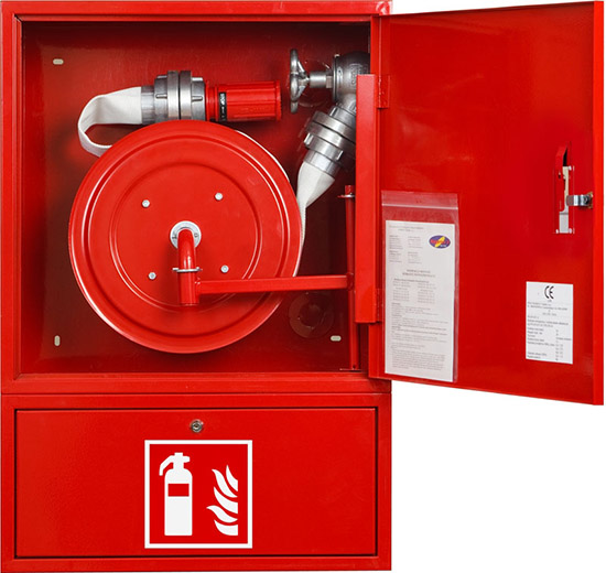 Hose reel in cabinet with a separate compartment or same compartment for housing either fire extinguishers, a hydrant landing valve or other equipment. Hose reel mounted on the door which opens 180°. The reel can easily be removed from the cabinet to facilitate the installation.